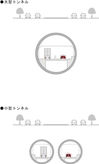 この地下自動車専用道路の建設により、軍民共用化に向けた横田基地へのアクセスが確保されると同時に、現在、国立府中インターから青梅インター間の所要時間約70分(平均時速30Km)が30分(時速80Km)と40分も短縮でき、CO2排出量の削減も可能となります。大口径のトンネルについては、走行面下の余剰空間を防災基地における防災機能の向上にも活用できるメリットがあり、また、小口径トンネルについては、我が国のおいては新たなチャレンジとなりますが、建設コストを削減できるメリットとともに、事故発生時の避難用トンネルとしてもう一方のトンネルを活用できることから、防災面でも注目すべきトンネルとなります。 |