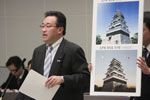 | 江戸城寛永度天守(かんえいどてんしゆ)は、都立中央図書館にたった1枚の「建地割図(たてじわりず)」が、遺されているだけで、設計図も絵図もなく、どんな城だったか謎でした。しかし、城郭復元研究の第一人者と言われる広島大学大学院の三浦正幸教授の協力のもと、遺された「建地割図(たてじわりず)から12枚の「復元図」が創作され、それを元にCGが作成され、平成22年6月、その全容が明らかになりました。世界の主要都市には、必ずと言っていいほど偉大なモニュメントがありますが、日本の首都・東京には、世界に誇れる歴史的・文化的シンボルがありません。そこで観光資源として、江戸城再建に向けた取り組みを求めています。 |